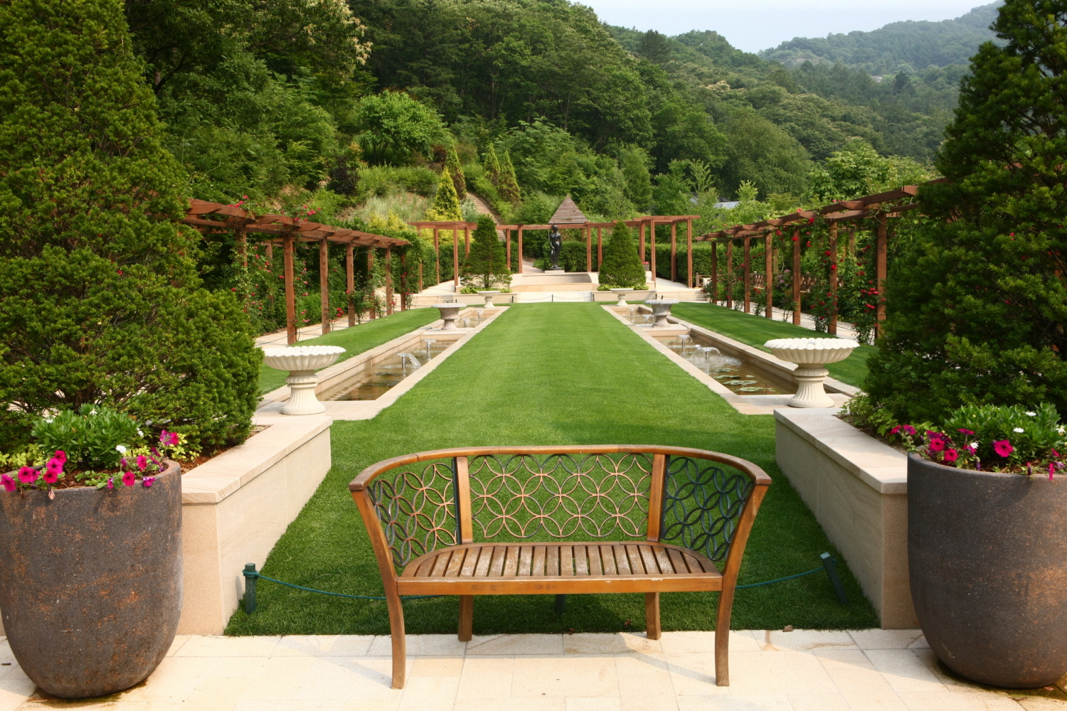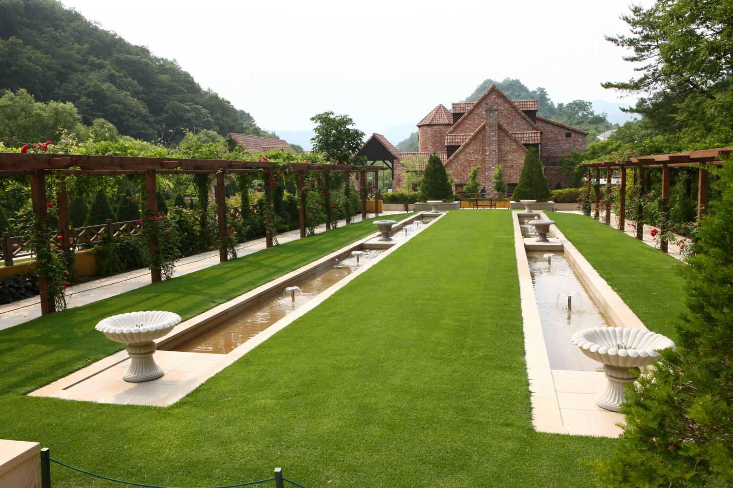 - 수목원 입구의 이탈리아 토스카나 풍 방문객센터, 영국풍 화단으로 꾸민 영국식보더가든,